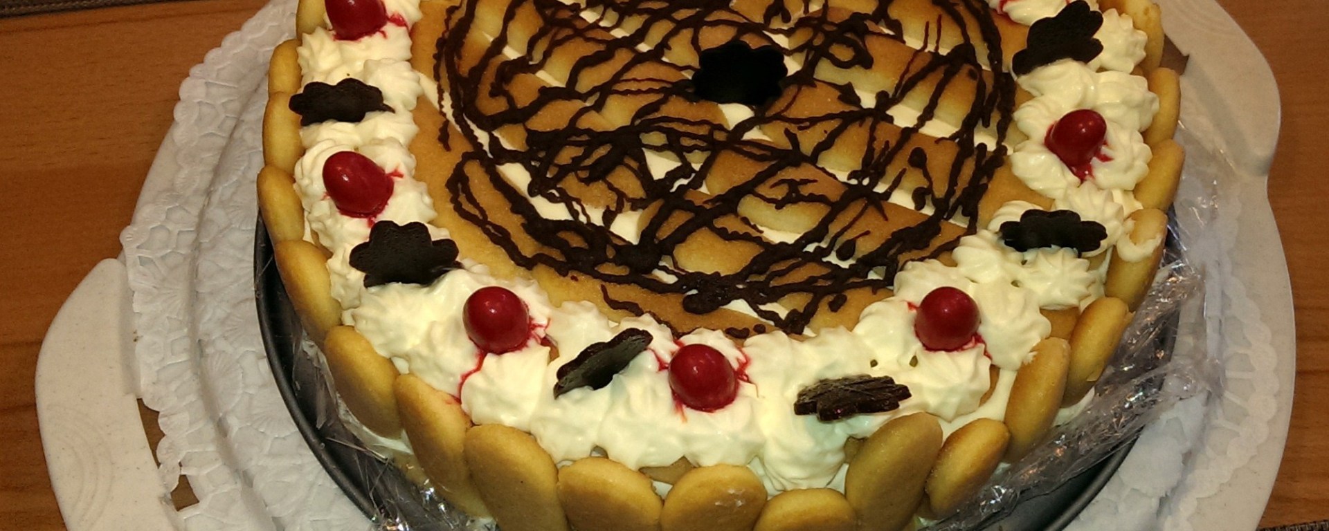 Den Rand entlang etwas Creme auftragen, halbe Biskotten (getränkt) den Rand entlang stellen. Danach Creme einfüllen, Biskotten auflegen, wieder Creme einfüllen usw. Gesamt 4 Lagen Biskotten! Mit Biskotten aufhören. Restliche Creme aufheben!