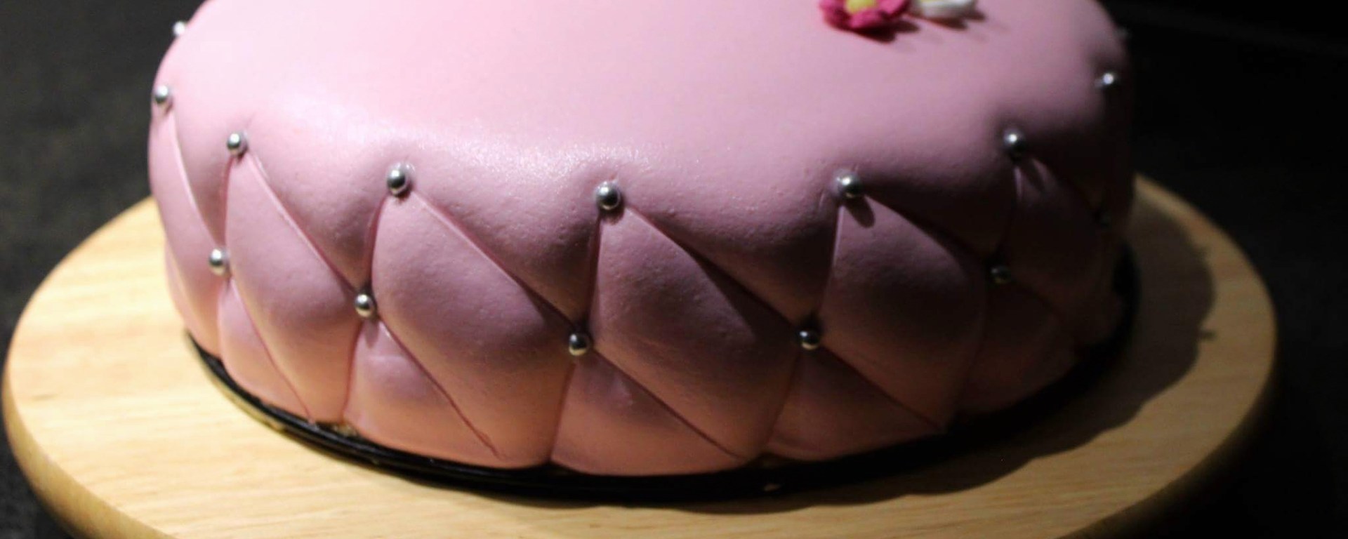 Fette deine Hände mit etwas Kokosöl ein und knete den Fondant weich. Rolle diesen auf einer Silikonmatte, Bäckerstärke oder Puderzucker ca. 3 mm dick aus. Decke die Torte mit dem Fondant ein. Streiche sie mit einem Fondant-Glätter glatt. Ritze in gleichmäßigen Abständen Linien in den Tortenrand – sodass ein Karomuster entsteht. Setze Silberperlen mit etwas essbaren Kleber an die Stellen, wo sich die Linien kreuzen. Dekoriere die Torte mit Zuckerblumen.
